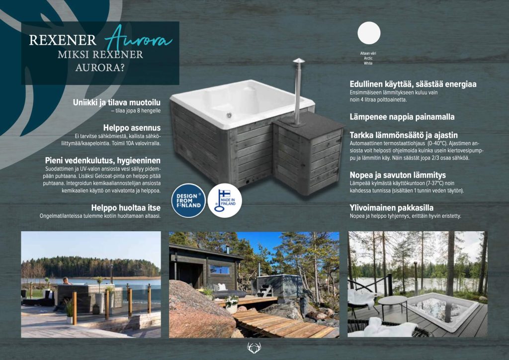 Rexener Aurora palju on Suomessa käsityönä valmistettu vuosien ammattitaidolla, jonka hyödyt on vertaansa vailla oleva laatu ja erinomainen mukavuus. Aurora-mallissa huomio kiinnittyy helposti yksityiskohtiin, jotka on tarkalleen suunniteltu vastaamaan kylpemisen odotuksia. Mullistavan Rexener Bioheaterin, Suomessa kehitetyn termostaattiohjatun lämmitysratkaisun voimanlähteenä Aurora-palju tarjoaa nopeaa ja kustannustehokasta veden lämmitystä ennennäkemättömällä tavalla.